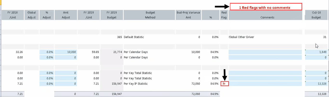 Depending on how your system is configured, the system may require you to enter comments when a line item exceeds a defined threshold in the Stat_Rev and Expense tabs before saving the plan file. A message will display above the Comments column header, informing you of the number of variances to address. A red flag icon displays in the Red Flag column. After you enter variance comments, you can save the plan file.