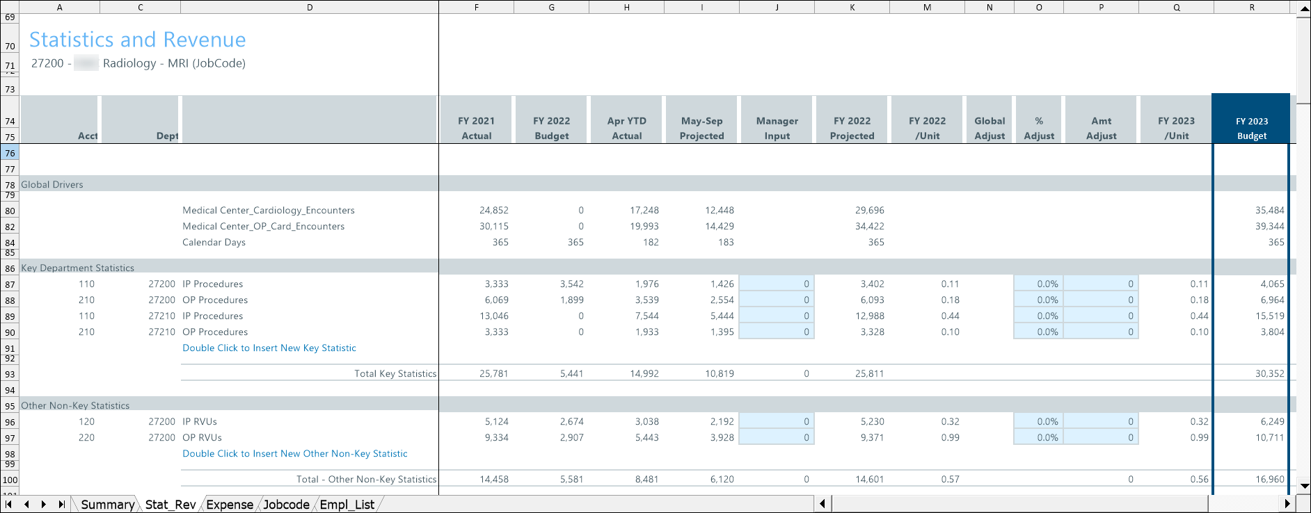 Use the Stat_Rev (Statistics and Revenue) tab to review and adjust current year projection amounts and next year’s budget for Statistics, Revenues, and Deductions.