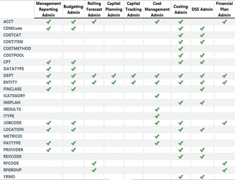 The following table represents which dimensions are part of each product. A check mark means users can access the dimension using the Dimension Maintenance Utility, but the records each user can edit depends on the security filter applied to each.