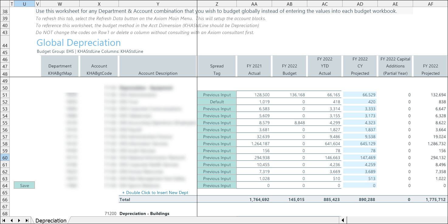NOTE: The value entered in the KHAStdLine Columns appears in the drivers KHACDimGrp column. Depreciation driver data populates the Expense tab of the budget plan file.