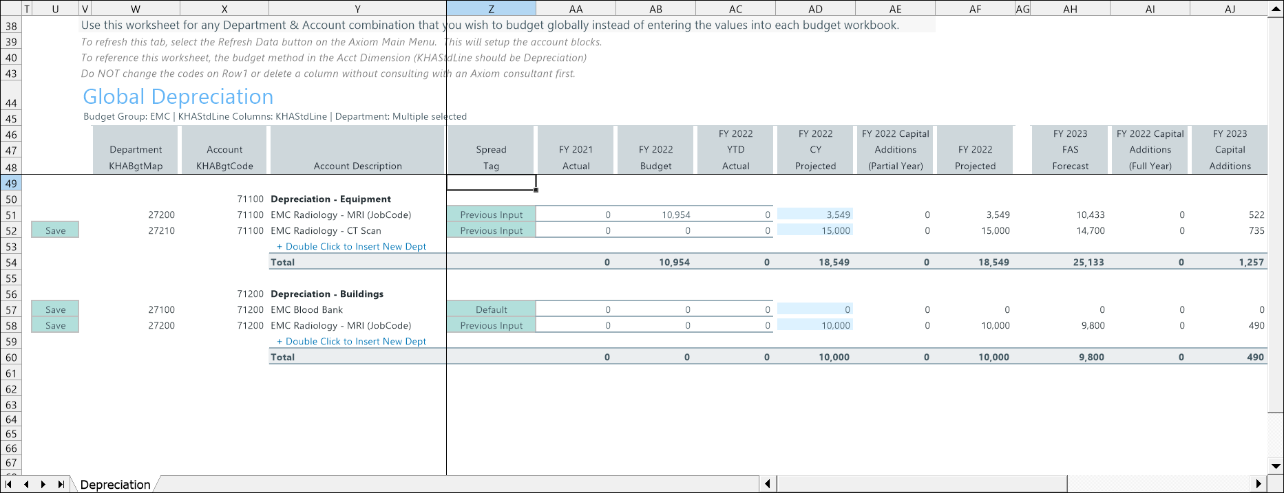 The 05 Budget Depreciation (Global Depreciation) driver provides a location to budget depreciation The allocation of the cost of a capital asset - such as medical equipment of buildings - over its useful life to reflect how the asset is used over time. for shared capital assets without entering the same values in multiple department budget plan files. By budgeting depreciation separately from operating expenses, healthcare organizations can see the ongoing cost of capital assets more clearly and make better decisions about future equipment purchases and facility investments.