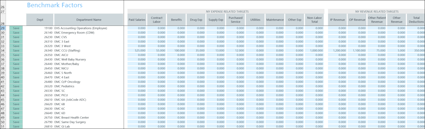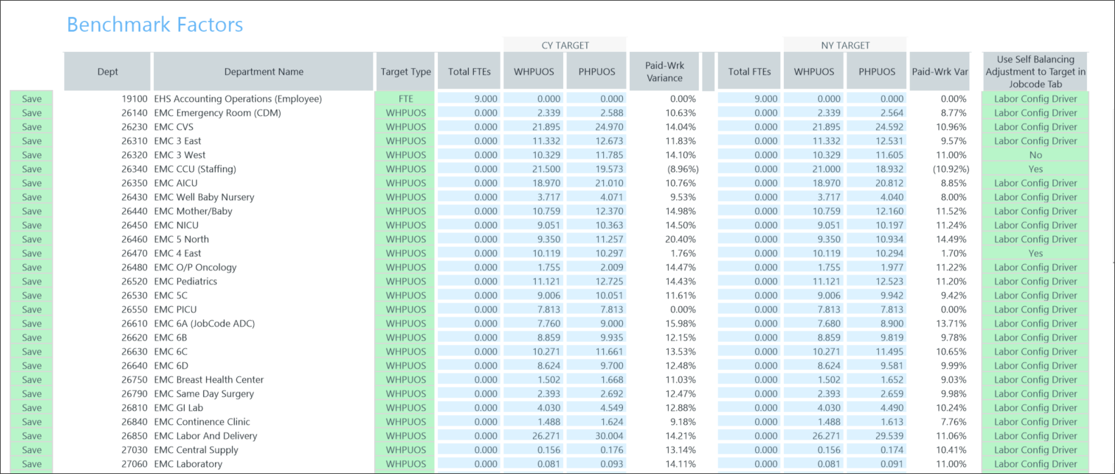 Use this driver to define a benchmark target of FTEs or Worked Hours per Unit of Service (WHPUOS) by one or more departments. You can define a target for the current year (CY Target) as well as the next year (NY Target). The Target Type column contains dropdowns to select the type of target to use for each department.