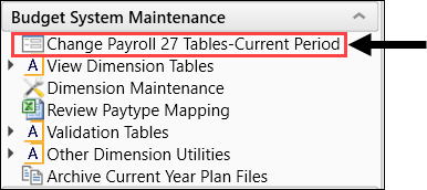 In the Bud Admin or Management Reporting Admin task pane, in the Budget System Maintenance section, double-click Change Payroll 27 Tables-Current Period.
