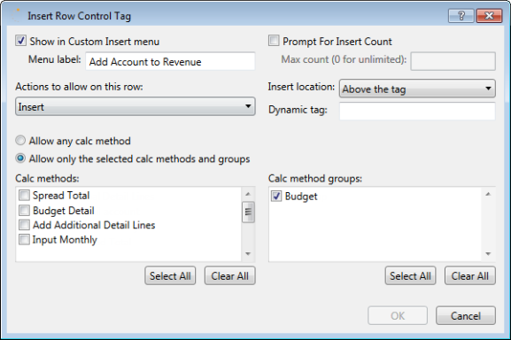• Specify the calc methods that can be used to insert or change on a particular row. Calc methods can be specified by individual calc method name and by calc method group.