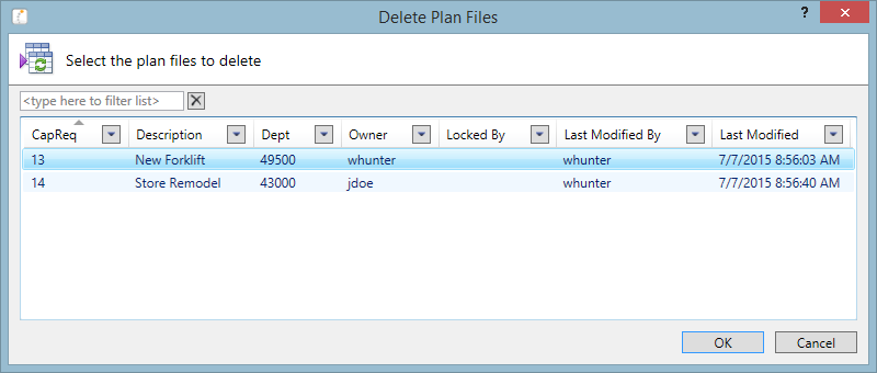 When a user executes the Delete Plan Files command from a custom task pane or ribbon tab, it opens the Delete Plan Files dialog. This dialog displays a list of the plan files that the user can delete. Generally speaking, administrators can delete any plan file, whereas end users can only delete plan files that they created (and where they have read/write access). The user can select one or more plan files to delete.