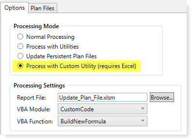 You can use the Process Plan Files feature to run a custom utility on plan files. The custom utility must be a Microsoft Excel spreadsheet that contains a VBA module with the custom code. This file must be saved within the Axiom Budget Planning and Performance Reporting file system, in the Reports Library.