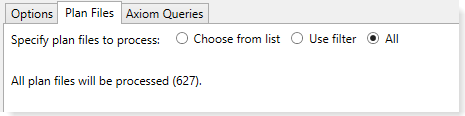 On the Plan Files tab, specify the plan files that you want to process. There are three different options that you can use to specify the plan files: Choose from list, Use filter, and All. You should use the option that corresponds to how many plan files you want to process—all plan files, or a subset of plan files. If you want to process a subset of plan files, you can select individual files to process or you can use a filter to define the subset.