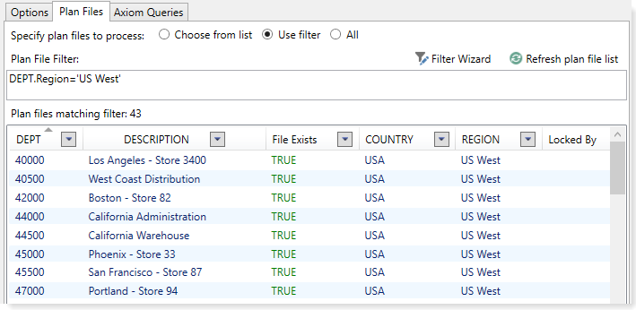 Once you have entered a filter, you can click Refresh plan file list to show the plan files that currently match the filter. The refresh feature is intended to help you determine whether you have defined the filter correctly.