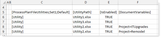 You might use document variables if you want to process the same utility repeatedly for the same plan file, using different values each time the utility is processed. The previous example screenshot processes Utility2.xlsx twice, using different values for the Project variable.