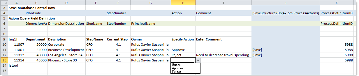 When an end user opens the file, the Axiom query is refreshed to show the user's current tasks. The user can fill out the Action column to specify the action to perform on the plan file. The save-to-database control column is set up with a formula so that once an action is selected in the Action column, the save tag is automatically populated. When the user saves, the actions are performed via the Save Type 4 setup. The Axiom query should be set up to refresh after save, so that it is repopulated with the latest tasks after saving.