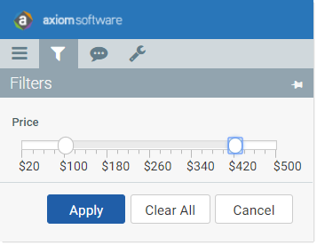 For example, you can use the range slider variable to prompt users to select the top and bottom values of a price range. The report can then be filtered to only bring in rows where the price falls within that range.