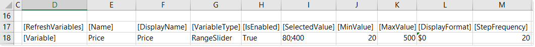 The following screenshot shows an example RangeSlider variable. The Selected Value field is populated to show what the values look like in the spreadsheet after the user selection.