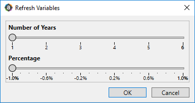 Slider refresh variables prompt users to select a value along a defined range of values, using a slider handle. The value is written back to the data source, where it can be used to impact data queries or other aspects of a report.