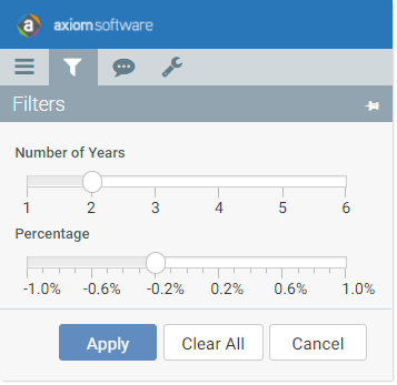 Axiom Budget Planning and Performance Reporting supports two types of variables that use slider handles. If you want users to be able to select a range of values instead of just a single value, use a RangeSlider refresh variable instead.