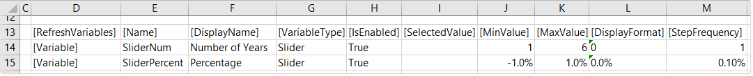 This section explains how to complete a variable row in the RefreshVariables data source when defining a Slider variable. Some data source columns do not apply in this case and are not discussed here. If these inapplicable columns are present in the data source, they should be left blank on rows that define Slider variable types. If you are using the Data Source Assistant to complete the variable properties, then only the applicable columns will be shown in the task pane.