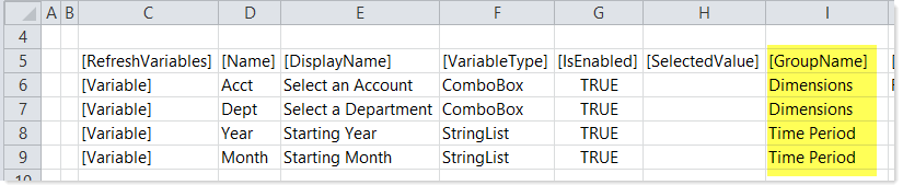 You can also use the [CollapseOnOpen] column (True/False) to specify that a group starts out as collapsed. By default, groups are expanded, but you can use this option to collapse groups as needed. If one variable in a group is set to True, then the group starts out as collapsed.
