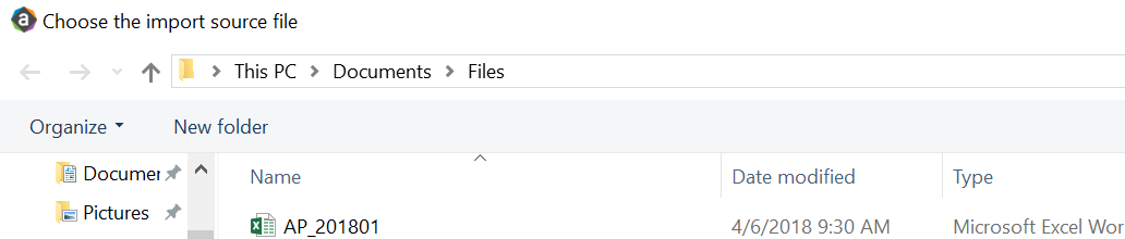 In the Choose the import source file dialog, go to the location where you stored the source file and select it.