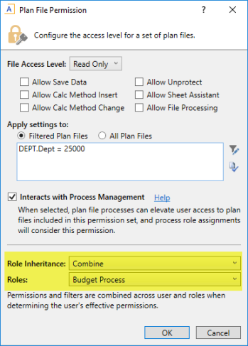 For example, imagine that a user belongs to the Budget Process role, and this role does not grant any permissions to the plan file. If Budget Process is assigned as the step owner, the user will be the step owner for Dept 25000 if they have an individual permission set that is combined with the Budget Process role as follows: