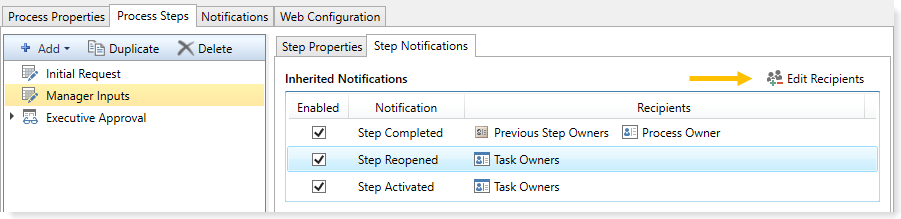 To add the user to the inherited notification, select the step and go to the Step Notifications sub-tab. Select the notification in the grid, then click Edit Recipients.