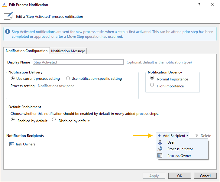 When you create or edit a notification at any level of the process, you can specify the recipients on the Notification Configuration tab of the Edit Process Notification dialog. The Add Recipient list only shows the recipients that are valid for the current notification type and process type.
