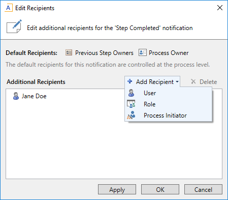 In the Edit Recipients dialog, you can see the default recipients defined for the inherited notification at the top of the dialog. You cannot remove any of these recipients, but you can add a recipient for this step only. In the following screenshot, the user Jane Doe will be included in the notification when this step is completed.