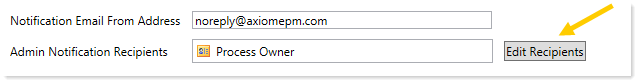 The Admin Notification Recipients are designated on the Notifications tab. By default, the process owner is the only recipient of these notifications. To add or remove recipients, click Edit Recipients.