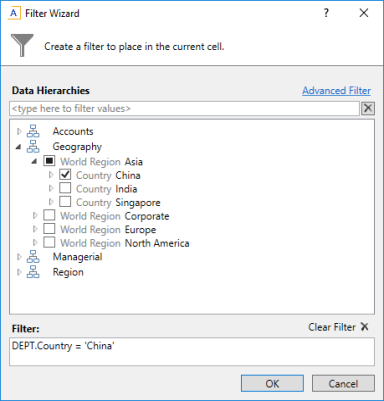 For example, you may have a hierarchy for Geography that starts at the WorldRegion level, then goes down to the Country level, and then goes down to the LocalRegion level. If you want to filter by a particular country in the Asia WorldRegion, you can expand the Geography hierarchy, then expand the Asia WorldRegion, and then select the desired country.