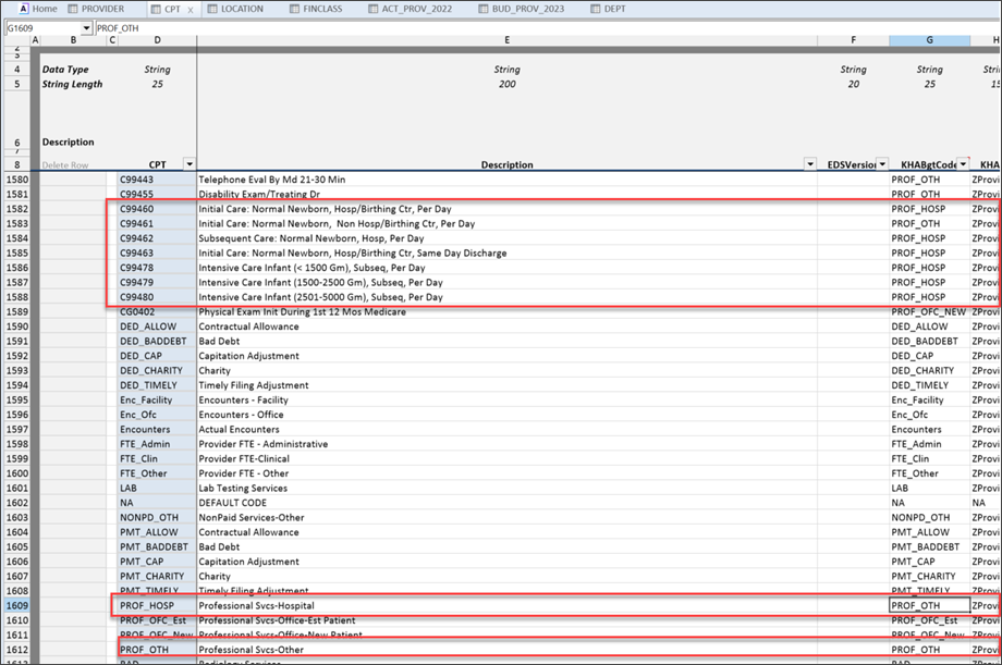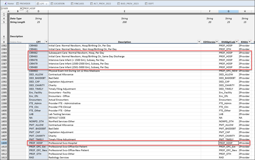 CPT codes roll into the Prof_Hosp code, which then roll into the Prof_OTH code. The KHAInt code = Zprovider for all affected areas.