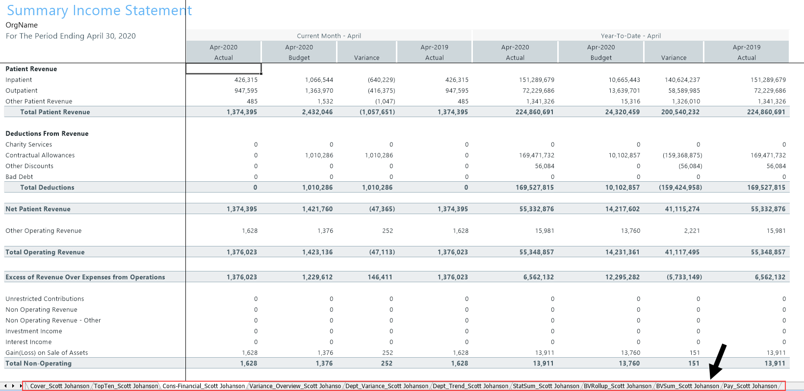 To help speed up report processing and distribution, you can generate manager-level reports by using the Department Monthly Package, which combines all of the individual reports into one file. The Department Monthly Package allows management personnel to view department performance against a static or flexible budget and against prior year’s performance and Enables one-stop shopping for the department manager by providing the department’s overall performance as well as reports with the detail transactions that support the expenses on the Summary reports. Each tab in the workbook represents a different report.