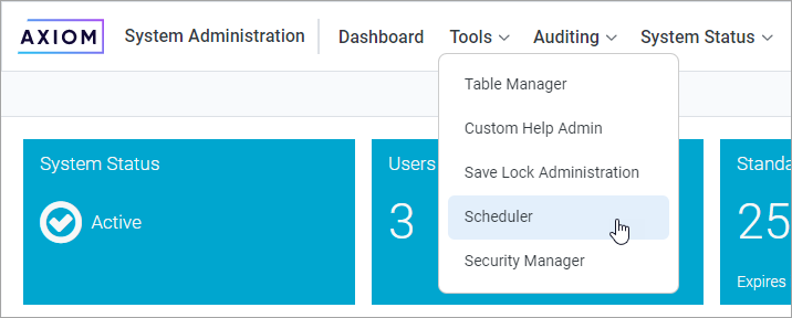 From the Navigation menu, select Tools > Scheduler.