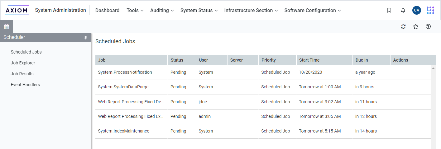 The Scheduler area of the Web Client can be used to monitor and manage the job schedule, review job results, and process existing jobs on demand. Only admins and users with the Scheduled Jobs User permission can access Scheduler.