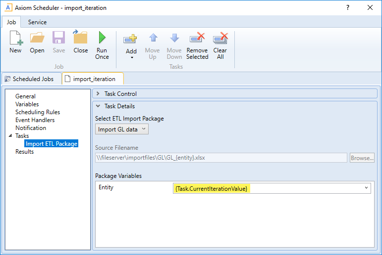 The import is configured with a variable {Entity}, which it uses to process the correct entity source file. To pass the current task iteration value to the import variable, use the job variable {Task.CurrentIterationValue} in the import task settings. For example: