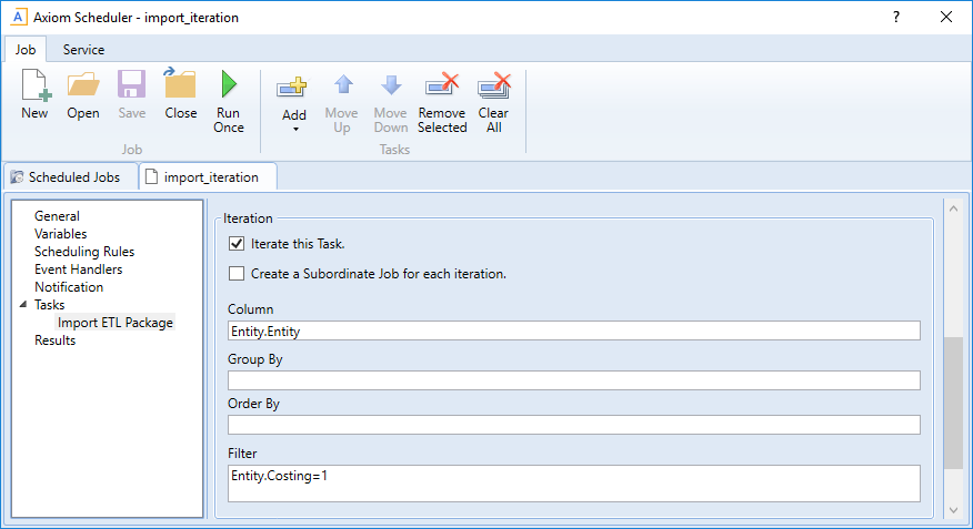 When you enable iterative processing for a task, you define the list of values by specifying a table column and an optional filter. The task will then be processed for each unique item in the table column. You can reference the column values within the task properties by using a built-in Scheduler job variable. As each iteration of the task is processed, the variable is replaced with the column value for the current iteration. Using this approach, the task can dynamically change for each iteration.
