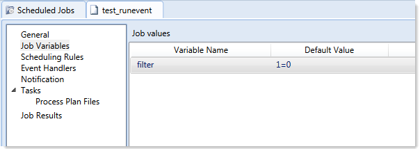 When using RunEvent to run a Scheduler job, you can pass a variable value to the job. For example, imagine that you want to run a Process Plan Files job, and you want to send a filter value to the job.