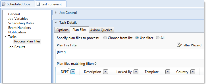 When the job is run using this RunEvent function, the value DEPT.Region='North' will be placed in the Plan File Filter box of the Process Plan Files task, and the job will be run using that filter.
