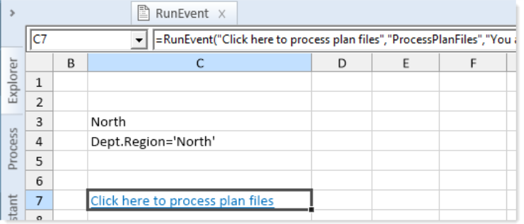 =RunEvent("Click here to process plan files","ProcessPlanFiles","You are about to process plan files for the "&C3&" region. Do you want to continue?",,"filter = "&C4)