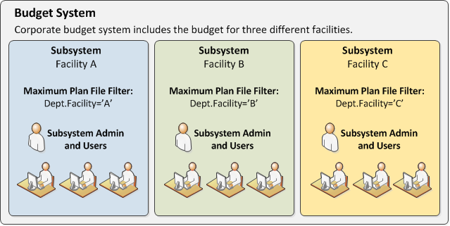 Within each subsystem, assign the facility's finance manager as the subsystem administrator. That user could then manage the rights for each user in the subsystem, including granting the users rights to the necessary plan files and reports (either individually or by using roles). The users can have a lower level of rights than what is allowed by the subsystem, but they cannot have a higher level.