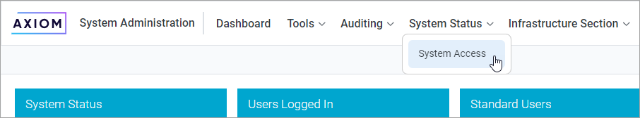 On the Axiom tab, in the Administration group, click Manage > Security > System Access.