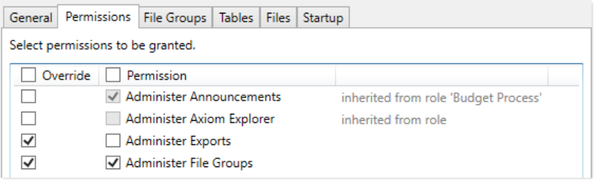 The Permissions tab of security defines access rights for specific Axiom Budget Planning and Performance Reporting features. By default, users inherit security permissions from any roles that they are assigned to. However, you can override role inheritance for a user on a per permission basis.
