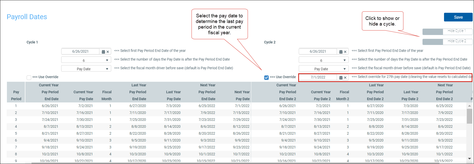 IMPORTANT: Organizations with more than two cycles do not display in Payroll Dates.