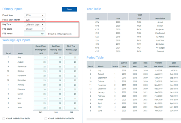 TIP: To hide the year and/or period tables, click the corresponding check boxes under the Working Days Inputs section.