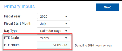 Option Description Fiscal Year Select the fiscal year. Fiscal Start Month Select the month in which the fiscal year starts. Day Type Select Calendar Days or Work Days. FTE Scale Select a Daily, Weekly, Monthly, or Yearly scale. FTE Hours Use one of the option to input the FTE value associated with the FTE Scale field selected above: