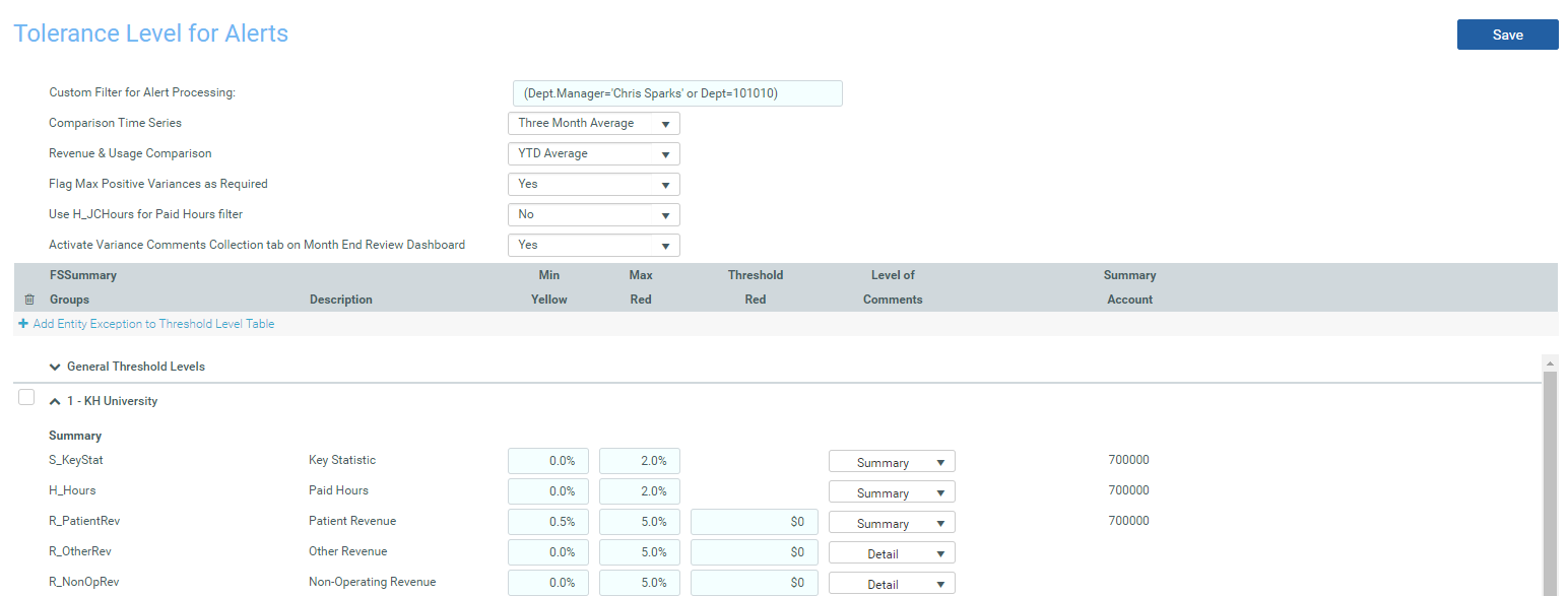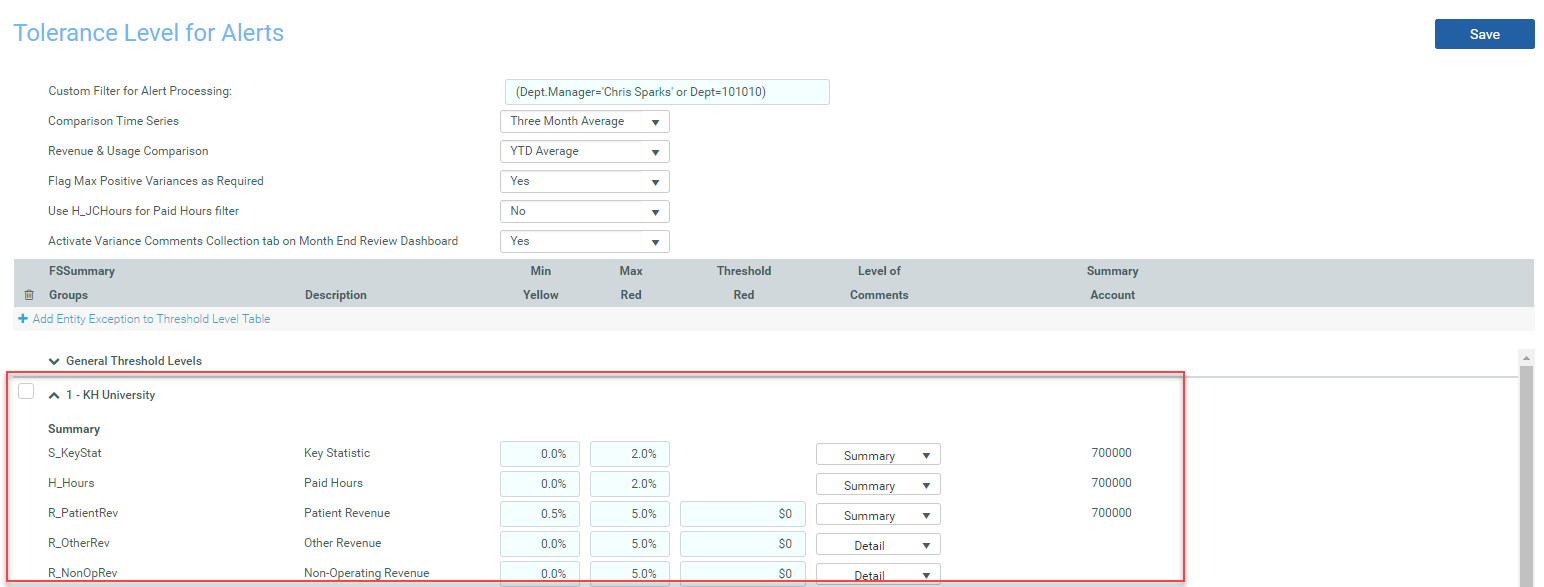 To only view thresholds for particular departments, type criteria in the Custom Filter for Alert Processing cell (e.g., "(Dept.Manager='Chris Sparks' or Dept=101010)").
