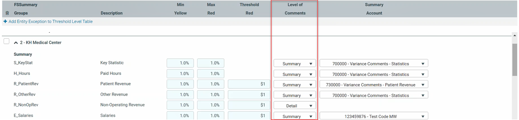 If using the summary level, you need to create a dummy account to accept comment input. You need to add the dummy accounts to the ACCT dimension table, and then indicated in the Summary Account column on the ThresholdLevel sheet.