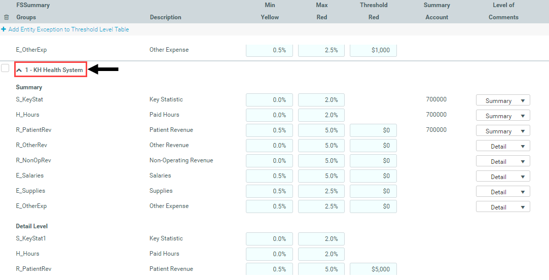 You can define exceptions for summary level (and all other Threshold settings by Entity) in the sections further down the worksheet.