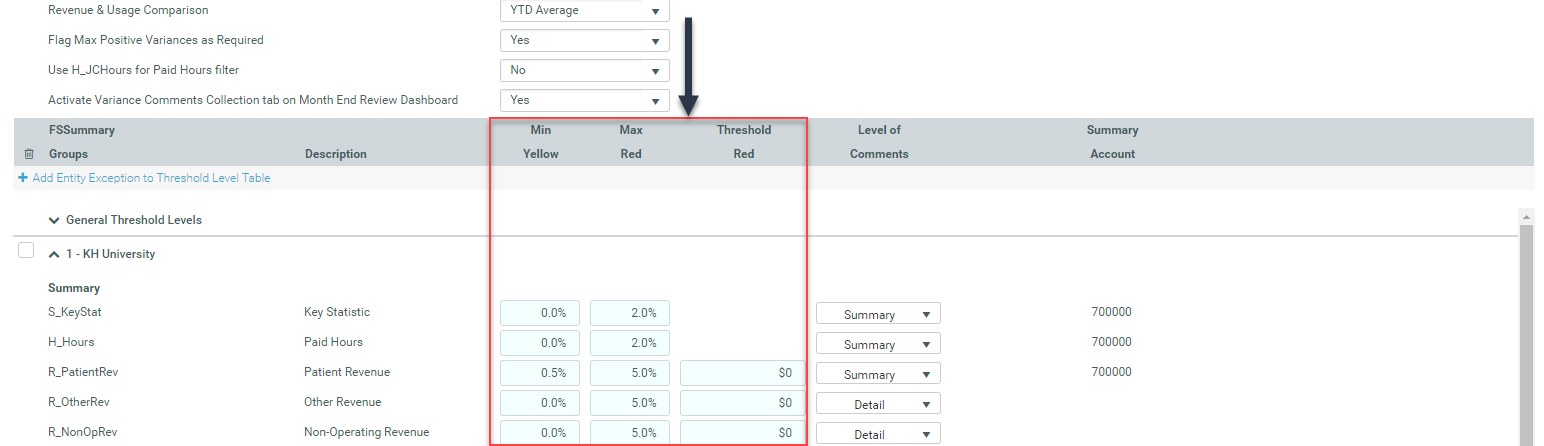 In the Summary portion of the General Threshold Levels section of the page, you may decide whether to collect comments at a summary level or account detail level.
