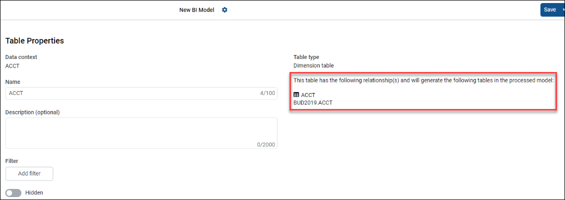 | Hidden | Click the Hidden toggle to hide the table when model definition is processed. The model is not visible in the visualization report. |